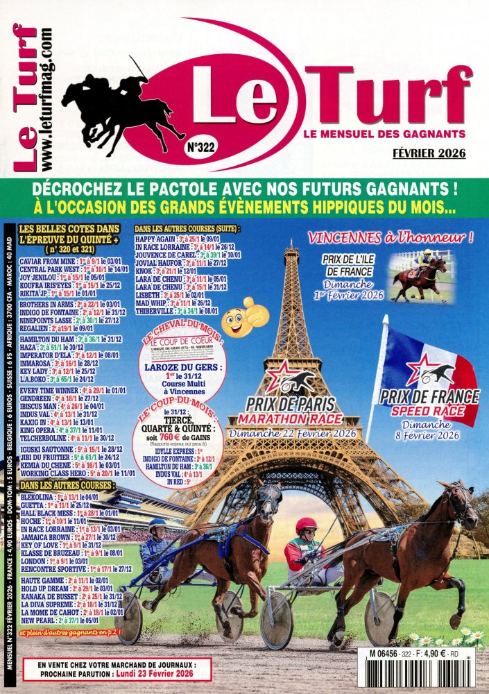 Le Turf Magazine : Nouvelle formule ! + Complet ! + Pratique ! En plus de cette sélection de futurs gagnants, chaque mois, retrouvez l’analyse de la réussite saisonnière des entraîneurs ainsi que la revue d’effectifs de la rédaction. Sans oublier un récapitulatif en fin de journal permettant au lecteur de voir en un clin d'œil si le cheval a été mentionné dans les 16 pages.